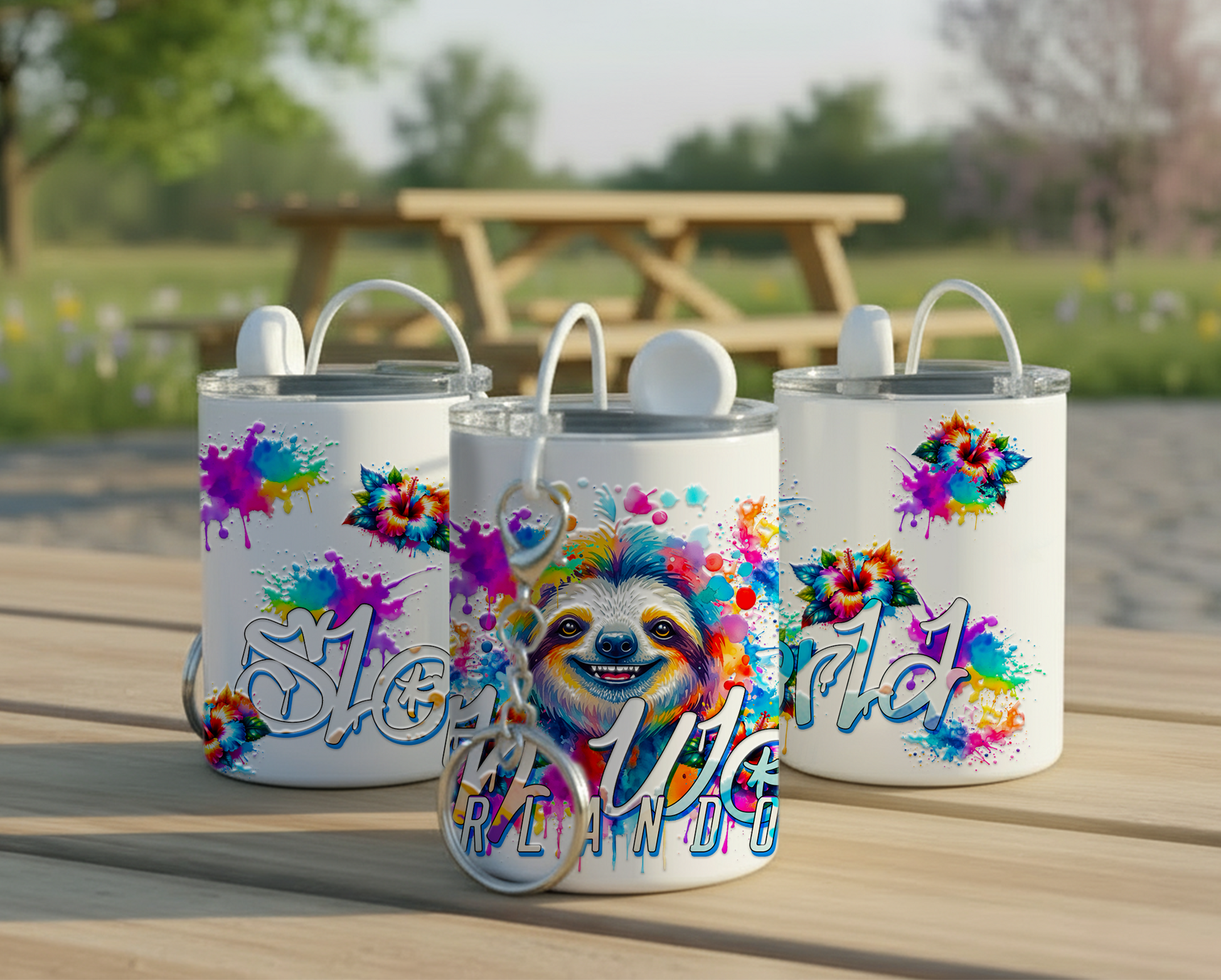 Clip on a burst of color with the electrifying "Splash of Happy" Keychain Tumbler! This miniature 3oz steel tumbler features a dynamic, wrap-around sublimation design that radiates pure, portable joy. The centerpiece is an adorable sloth whose face is vividly rendered in a kaleidoscope of bright colors, surrounded by an explosive paint splash and tropical hibiscus flowers. Anchored by the bold, dripping graffiti-style "SLOTH WORLD ORLANDO" logo, this keychain tumbler is the ultimate compact accessory to brighten your keys, backpack, or purse!