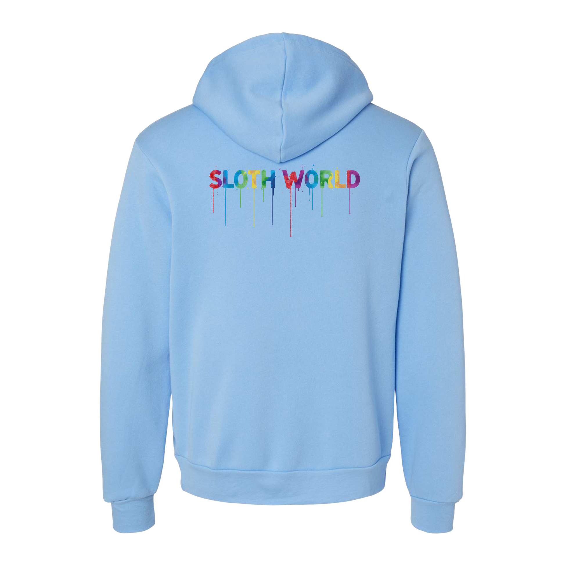 This cozy garment features a stunning graphic that is bursting with artistic energy. The central scene showcases adorable sloths nestled within an explosion of watercolor florals and tropical leaves. Every detail is rendered in brilliant, high-saturation hues of the rainbow. Crowned by the "SLOTH WORLD" logo, which is dripping with color, this hoodie is the ultimate happy, warm accessory for those who love color and comfort!
