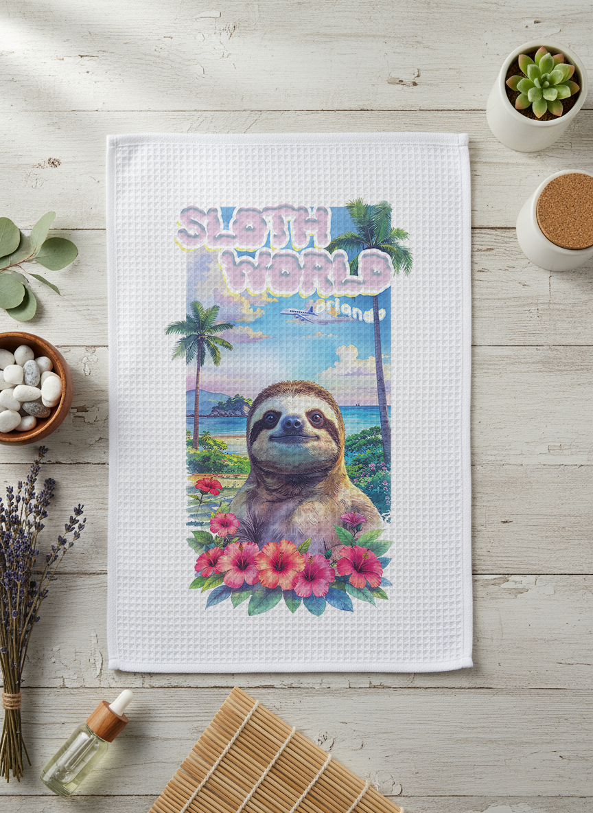 Escape to a tropical paradise every time you reach for our enchanting "Hibiscus Hangout" Sloth World Heavyweight Microfiber Waffleweave Towel! This isn't just a towel; it's a window to a serene, sunny getaway, bringing the laid-back vibes of Orlando and the irresistible charm of our favorite slow-moving friend right into your home.