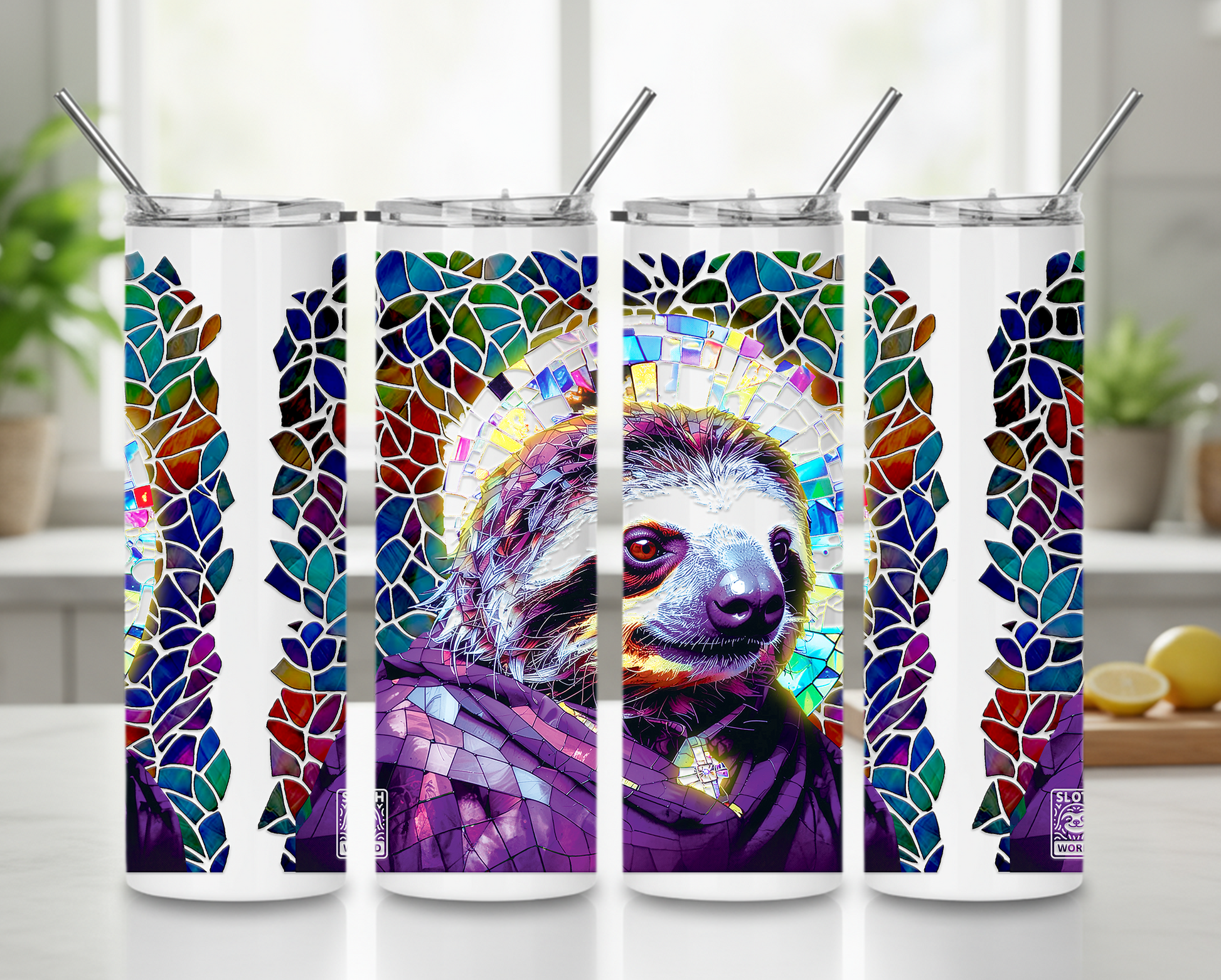 Elevate your daily hydration with our truly captivating "Sloth Saint" 30oz tumbler. This extraordinary design features a tranquil sloth rendered in a stunning stained-glass mosaic style, radiating a serene glow. Surrounded by elegant, colorful leaf patterns, it transforms your tumbler into a wearable piece of art. Crafted from premium stainless steel, it's designed to keep your drinks perfectly cold or hot for hours, providing a moment of calm and beauty with every sip. It's more than a tumbler; it's an illuminated vessel for your favorite beverages.