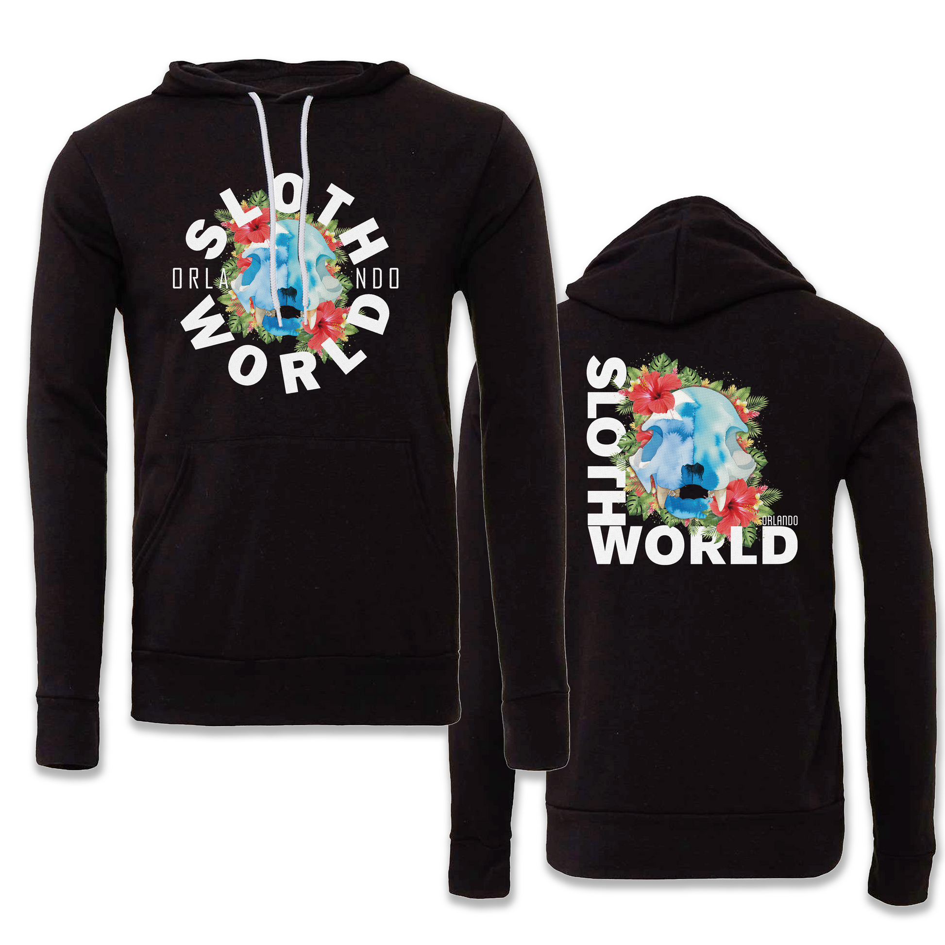 Front Design: Features a centered, circular "Sloth World" emblem with "Orlando" branding. At its heart is a stylized, color-toned skull nestled within a lush arrangement of tropical greenery and bright red hibiscus flowers.