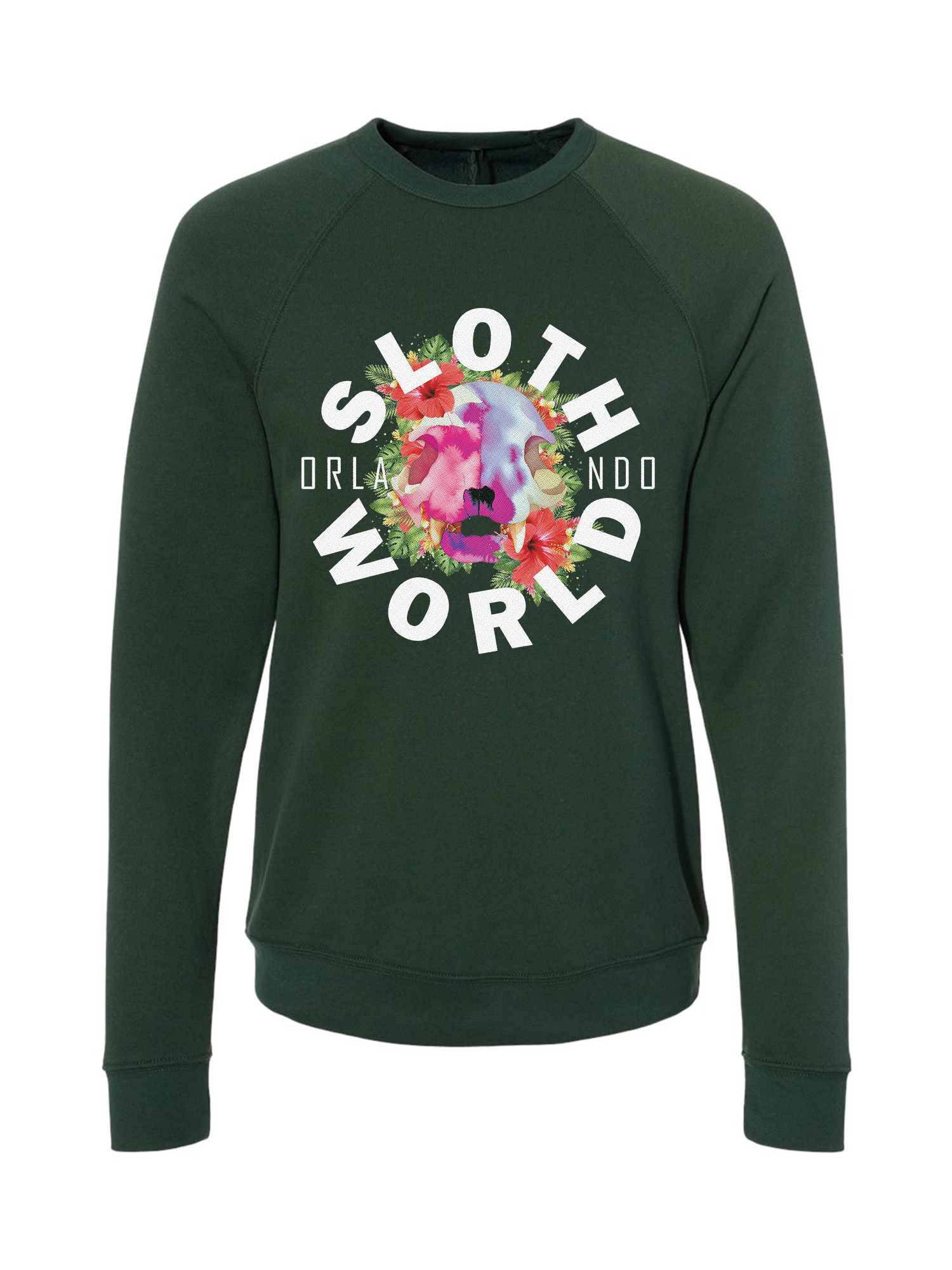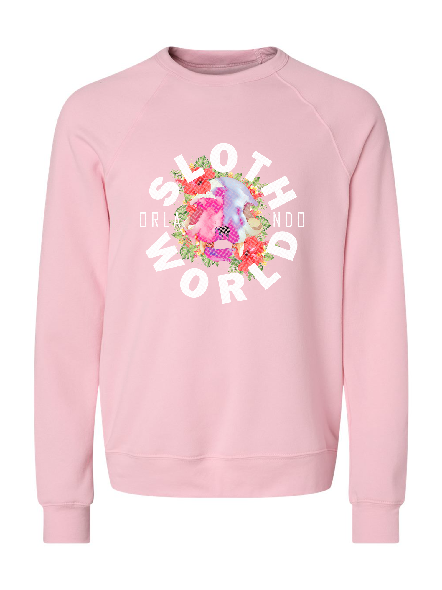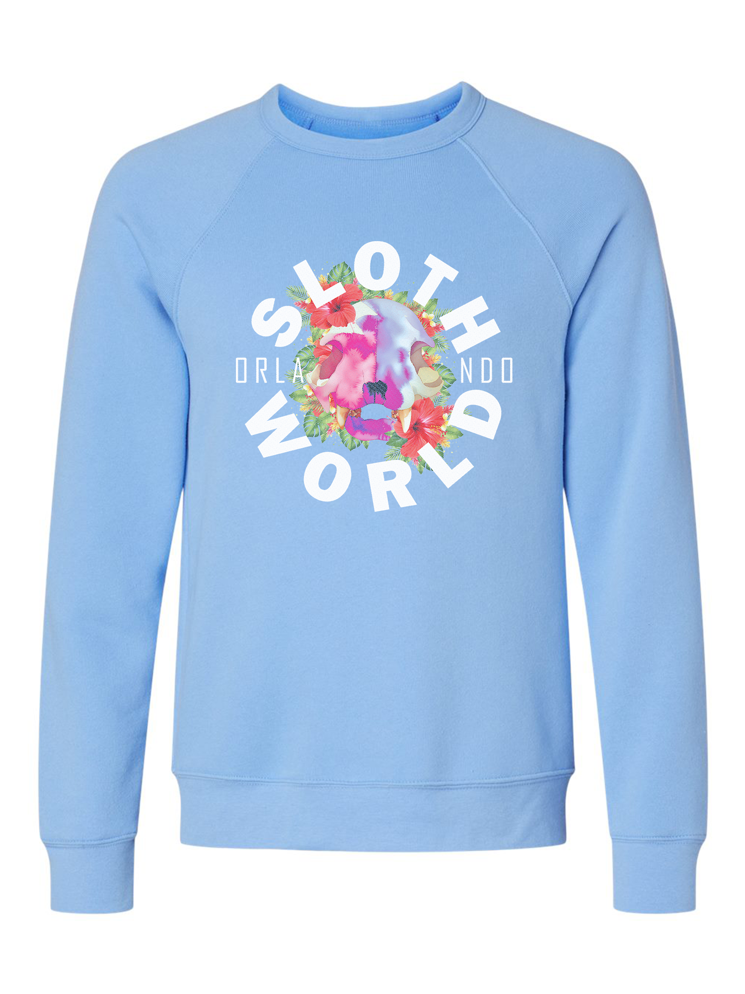 Show off your wild side with the "Hibiscus Skull" sweatshirt. This bold design flips the script on the traditional souvenir, featuring a stylized blue skull entwined with vibrant red hibiscus flowers and lush tropical greenery.