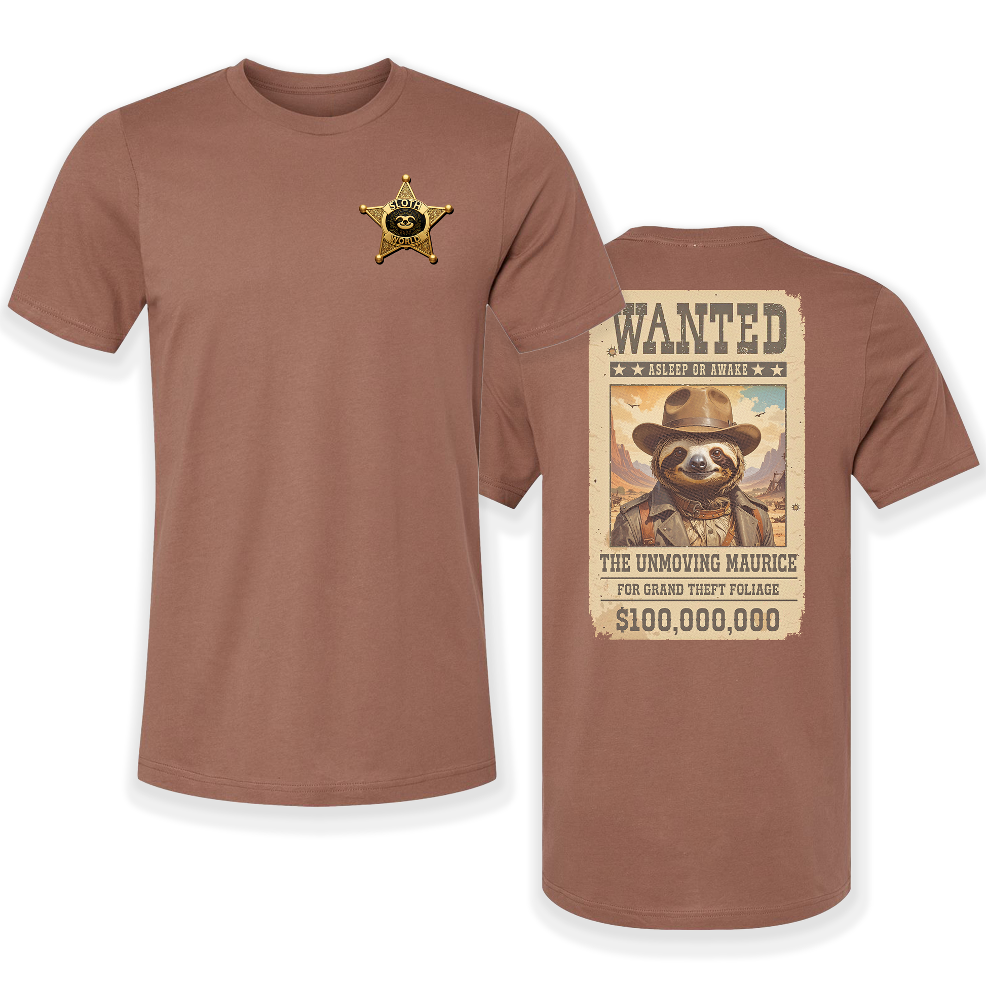 Our "Wanted: Unforgivably Sleepy" tee features a truly notorious character – Maurice, wanted for the heinous crime of "Grand Theft Foliage." With a staggering reward of $100,000,000 (and possibly a nap), this Western-style wanted poster captures the legendary stillness of the wilderness's slowest outlaw.